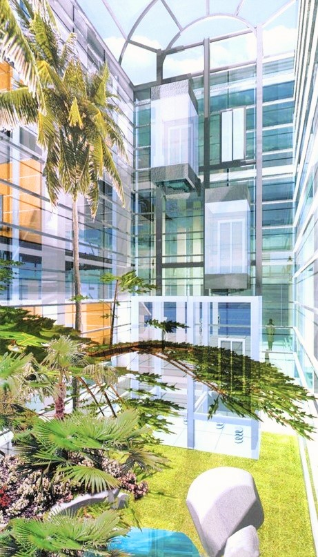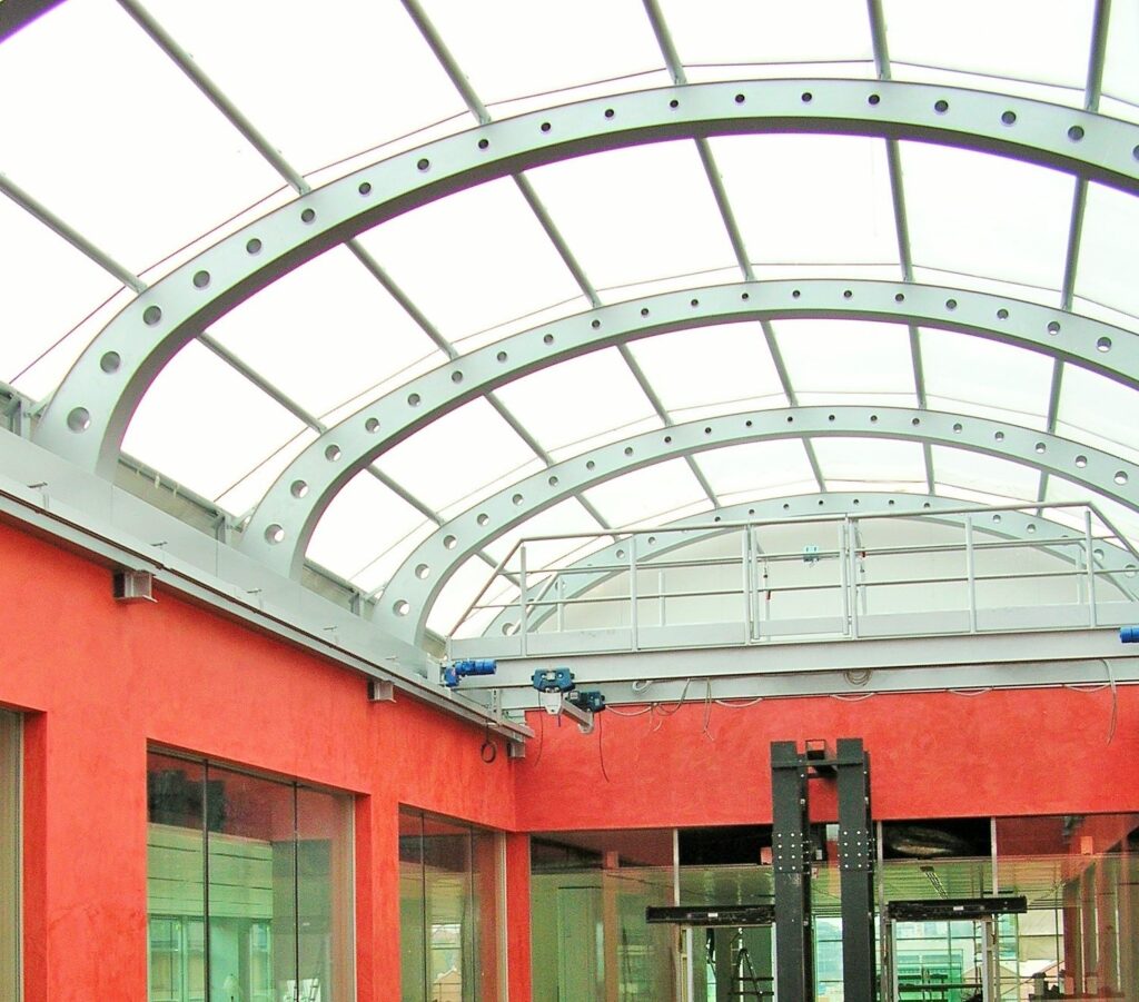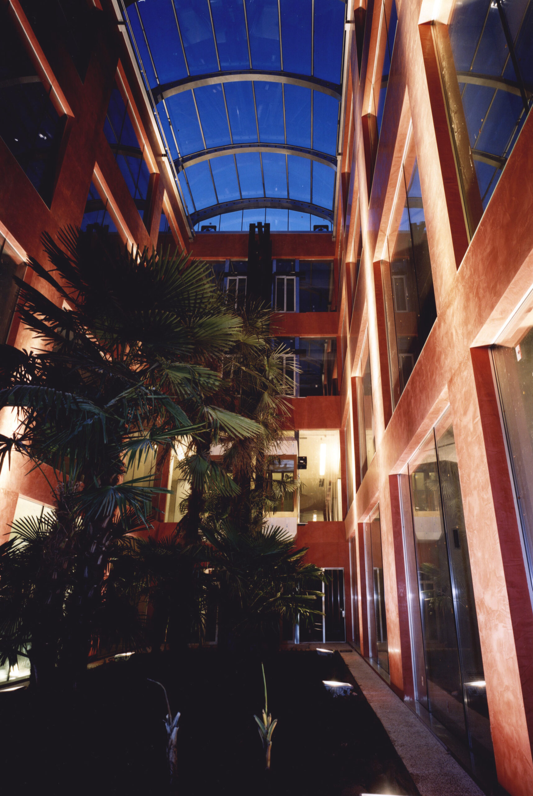 Lo svuotamento della copertura e la formazione di un lucernario vetrato hanno consentito di illuminare gli uffici ai piani sottostanti fino a raggiungere il giardino della corte interna.