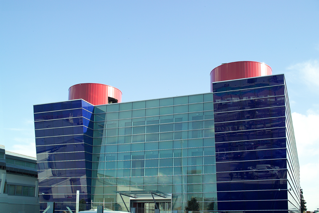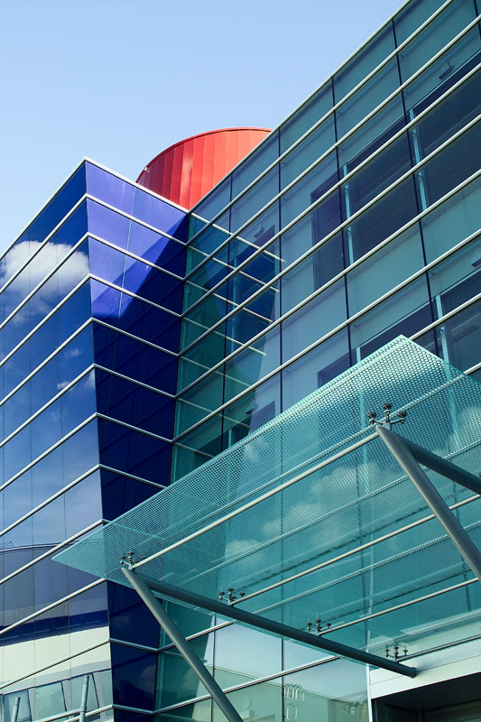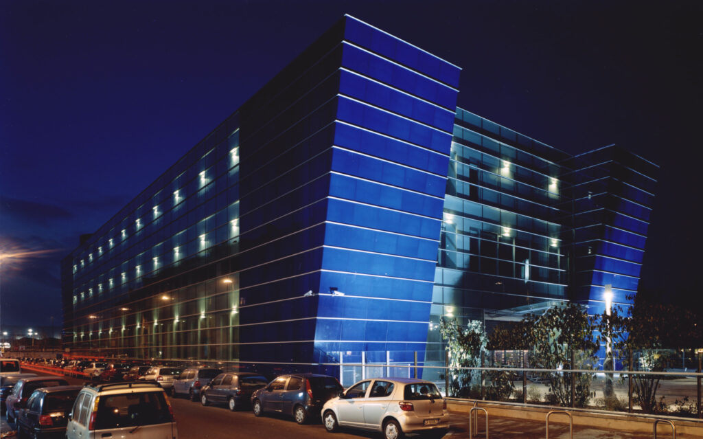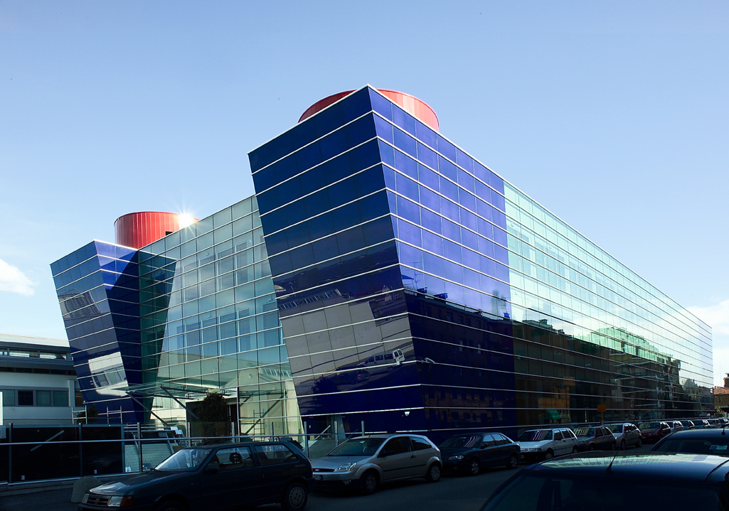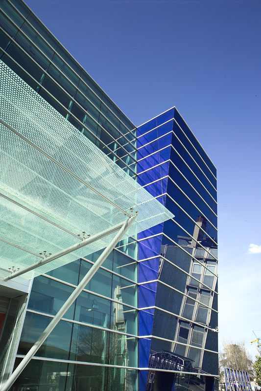 Ai quattro angoli troviamo superfici inclinate che formano colonne vetrate di colore blu-prussia. Così, l’edificio si presenta imponente e con una forte identità, distinguendosi dai fabbricati adiacenti.