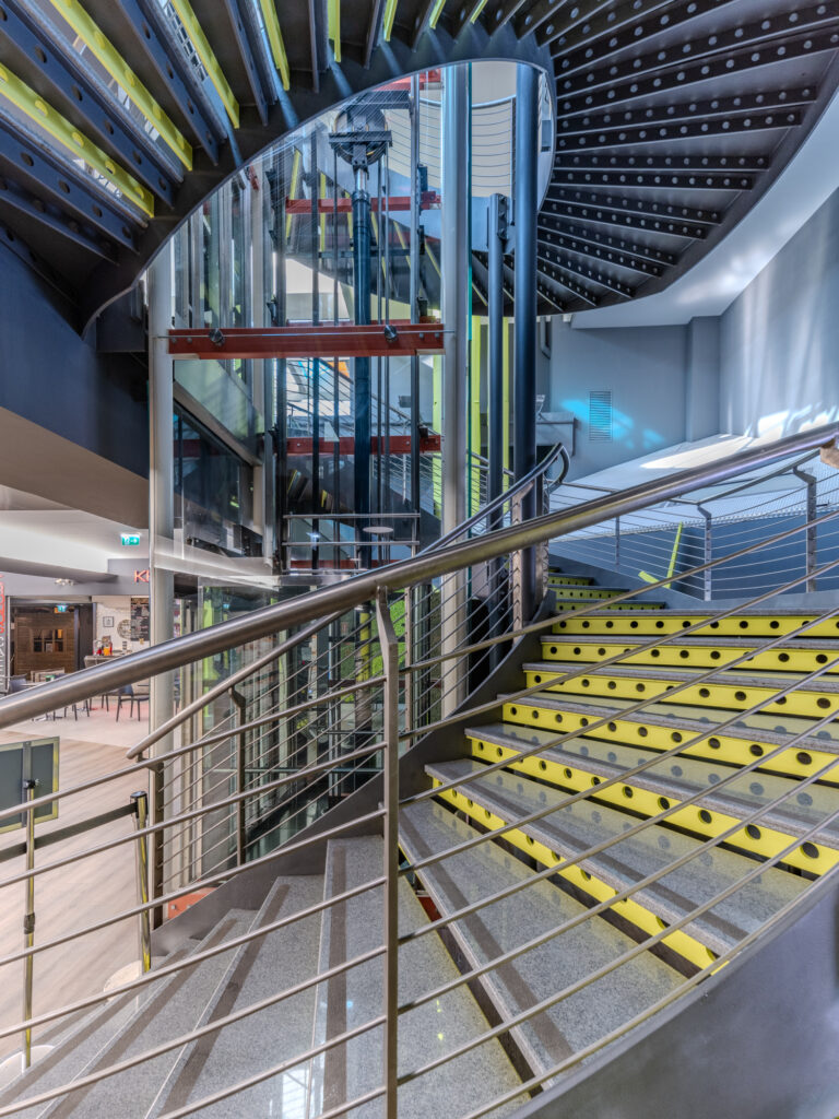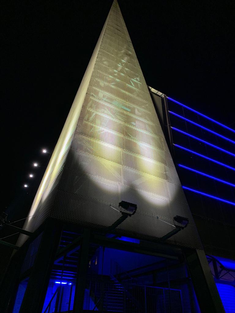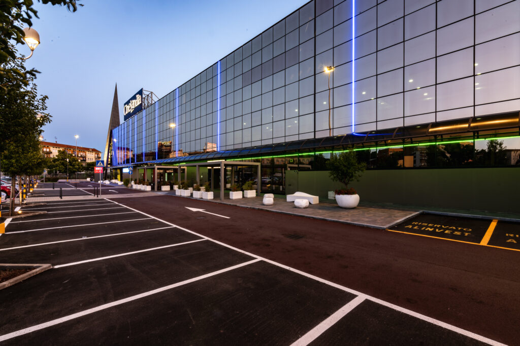 Le facciate in vetro specchiato nella tonalità dell’oro sono mantenute, l’ingresso è sottolineato da una gigantesca piramide di forma molto verticalizzata, visibile anche e soprattutto da lontano, forte richiamo visivo e simbolico per la struttura.