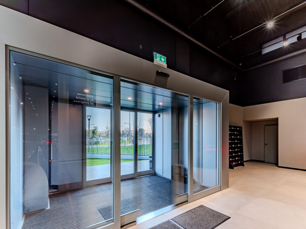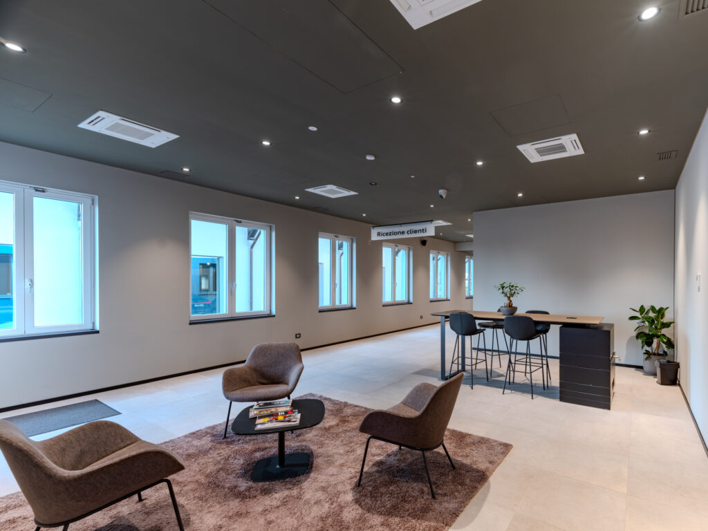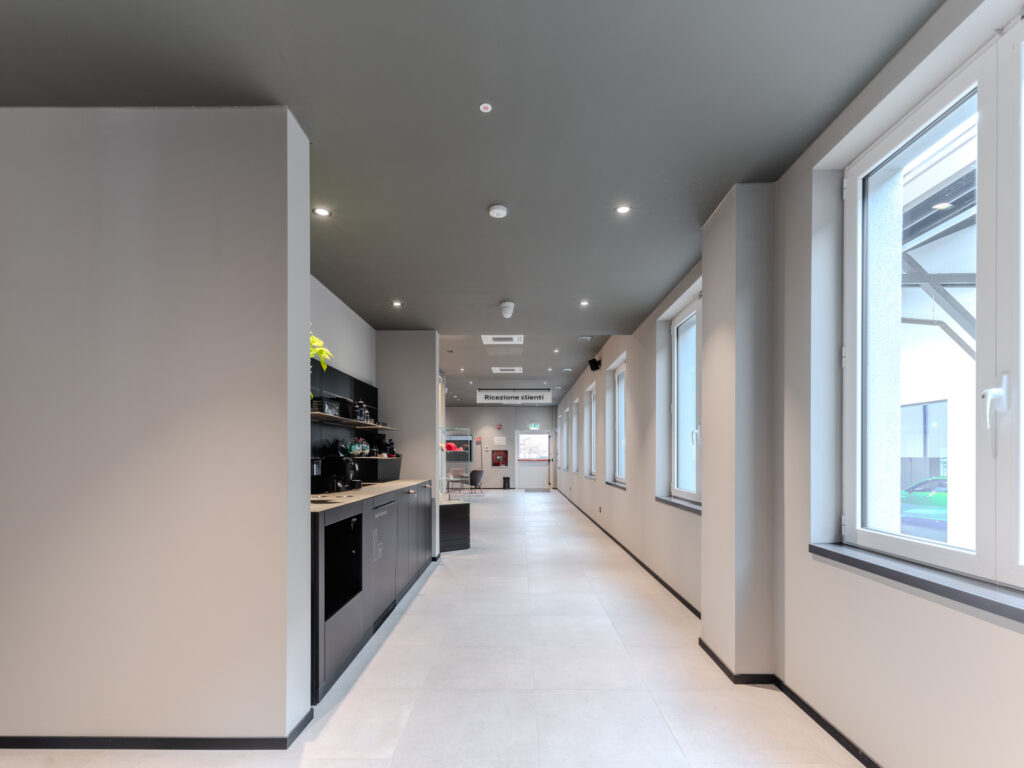 Il corpo principale è stato caratterizzato dall’Arch. Riccardo Torrini con l’inserimento sulle due facciate principali di una finestratura cielo-terra ripartita da travi e colonne in alluminio, al fine di ottenere una splendida illuminazione a giorno in sinergia con i due grandi lucernari posti in copertura.