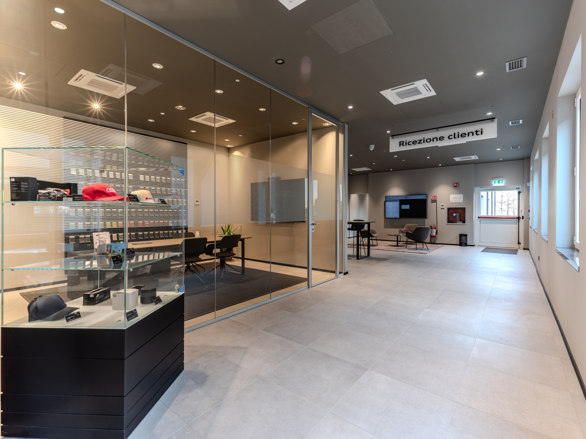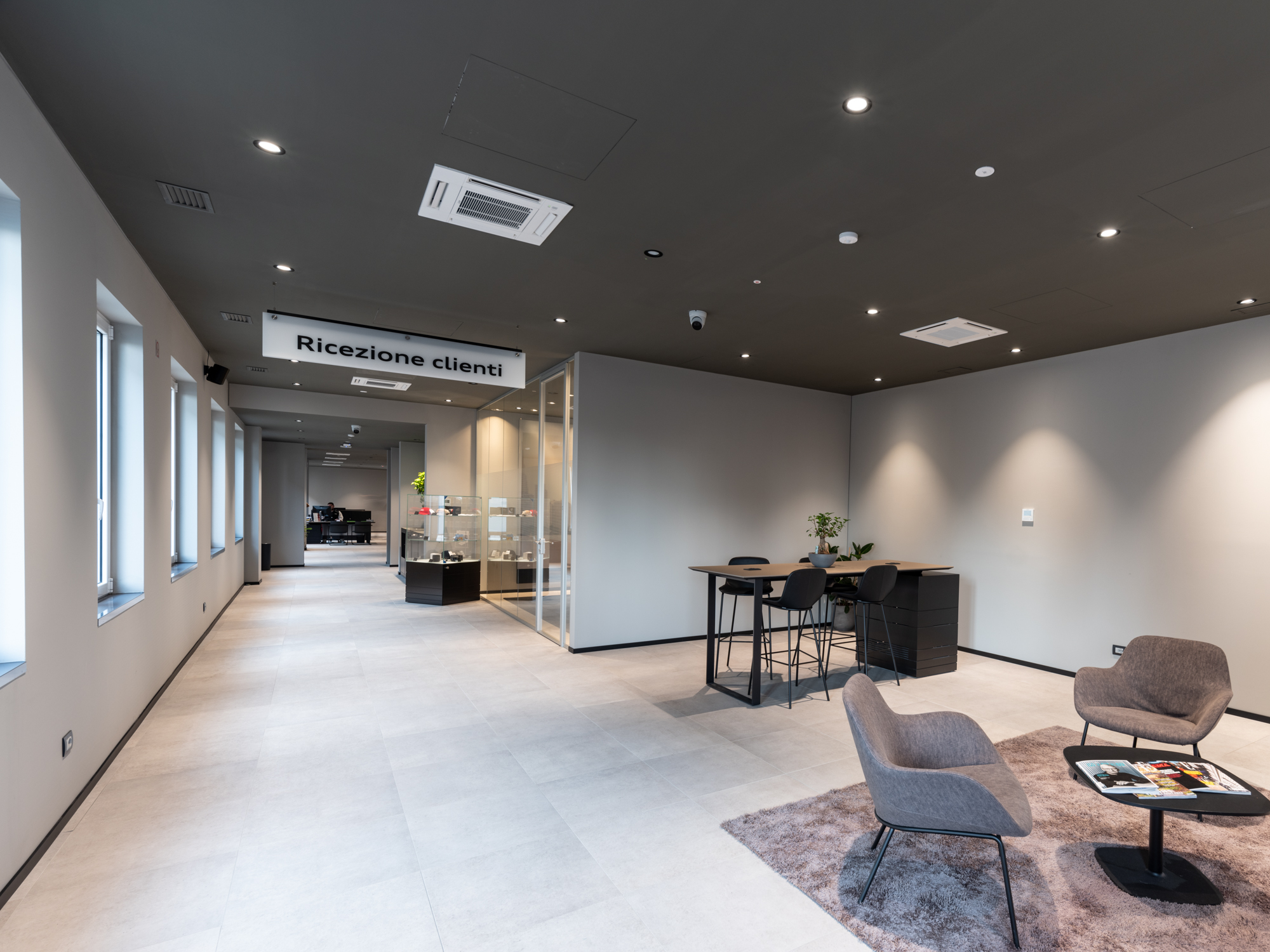 Il corpo principale è stato caratterizzato dall’Arch. Riccardo Torrini con l’inserimento sulle due facciate principali di una finestratura cielo-terra ripartita da travi e colonne in alluminio, al fine di ottenere una splendida illuminazione a giorno in sinergia con i due grandi lucernari posti in copertura.
